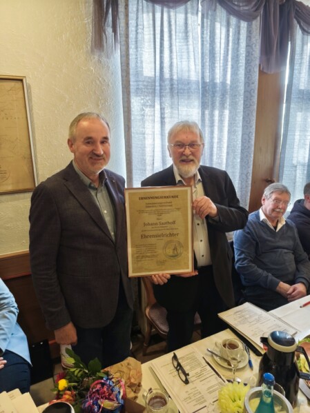 Anschließend wurde Andreas Bontjer einstimmig als stellvertretender Obersielrichter gewählt. Der bisherige Amtsinhaber, Johann Saathoff, war im Wahlkreis IX nicht wieder zur Wahl als Ausschußmitglied angetreten. Mit dankenden Worten bedankte sich Obersielrichter Heiko Albers für seinen jahrzehntelangen ehrenamtlichen Einsatz und überreichte ein Präsent. Im Anschluss wurde Johann Saathoff zum Ehrensielrichter ernannt und erhielt eine Ehrenurkunde.